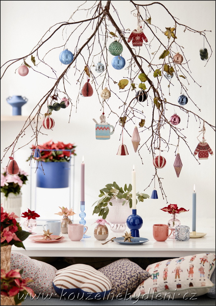 Neformální aranžmá kombinující jemné pastelové tóny se zářivě modrou barvou dokazuje, že k vytvoření skvělého prostírání není nutně potřeba sváteční ubrus ani prémiový porcelán. Větev ozdobená retro dekoracemi visící ze stropu, pohodlné polštářky, bublinkové svícny, a nádherné vánoční hvězdy v květináčích a malých vázách – to vše dodá vánoční snídani nebo konferenčnímu stolku uvolněnou atmosféru a podpoří pozitivní náladu.
