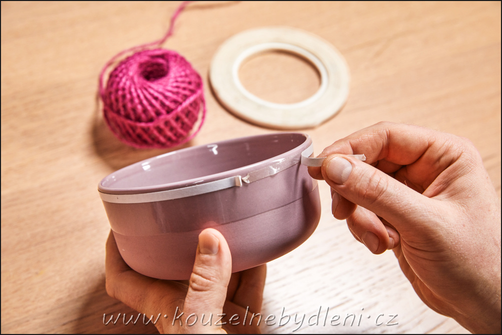 Zde je návod, jak ji vyrobit: Začněte nalepením oboustranné pásky na vnější okraj misek. Poté na vnitřní stranu misek připevněte horkým lepidlem skleničku. Jakmile lepidlo ztuhne, omotejte vlnu kolem misek znovu a znovu, vedle stopky sklenice nacházející se uprostřed. Tak vznikne základ pro vkládání rostlin. Lepicí páska zajistí, že nic nevyklouzne. Nakonec naplňte misku vodou a mezi provázky vložte květiny.