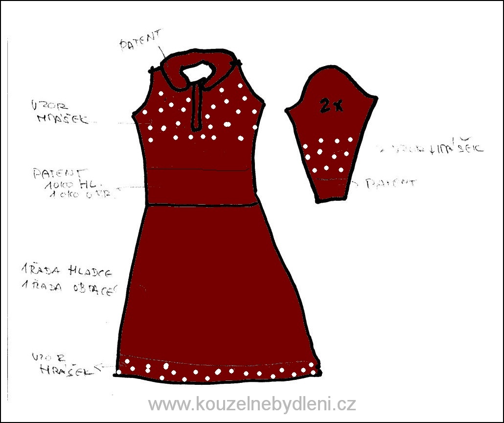 Šaty pleteme z pěti dílů, tedy v podstatě upleteme svetřík, sešijeme ho a v jeho spodní části nahodíme na kruhové jehlice oka a pleteme kolem dokola (postupně v dalších řadách přidáváme oka, aby se sukně rozšiřovala) až po požadovanou délku sukně. Postupujeme:
